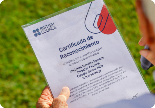 El British Council otorgó al Colegio Bilingüe Divino Niño un reconocimiento especial por su compromiso con la implementación de programas internacionales y por los logros alcanzados en la formación académica y bilingüe de nuestros estudiantes.